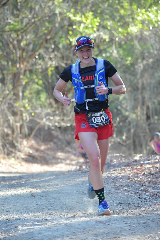 It was when we hit the bottom that reality hit home…heat, smashed quads and sore joints…with still 17k to go! A short 6k loop allowed us to pass each other a couple of times and continue the high fives and the encouragement, but the mental challenges had only really just began. Smurf, no longer able to keep his ego in check, started to chase the athletes in front and began burning matches. Smurfette really started to feel the heat, having to make a few hydration adjustments, and also had a little ‘damn’ moment with the girl she had taken for 2nd place catching up again.