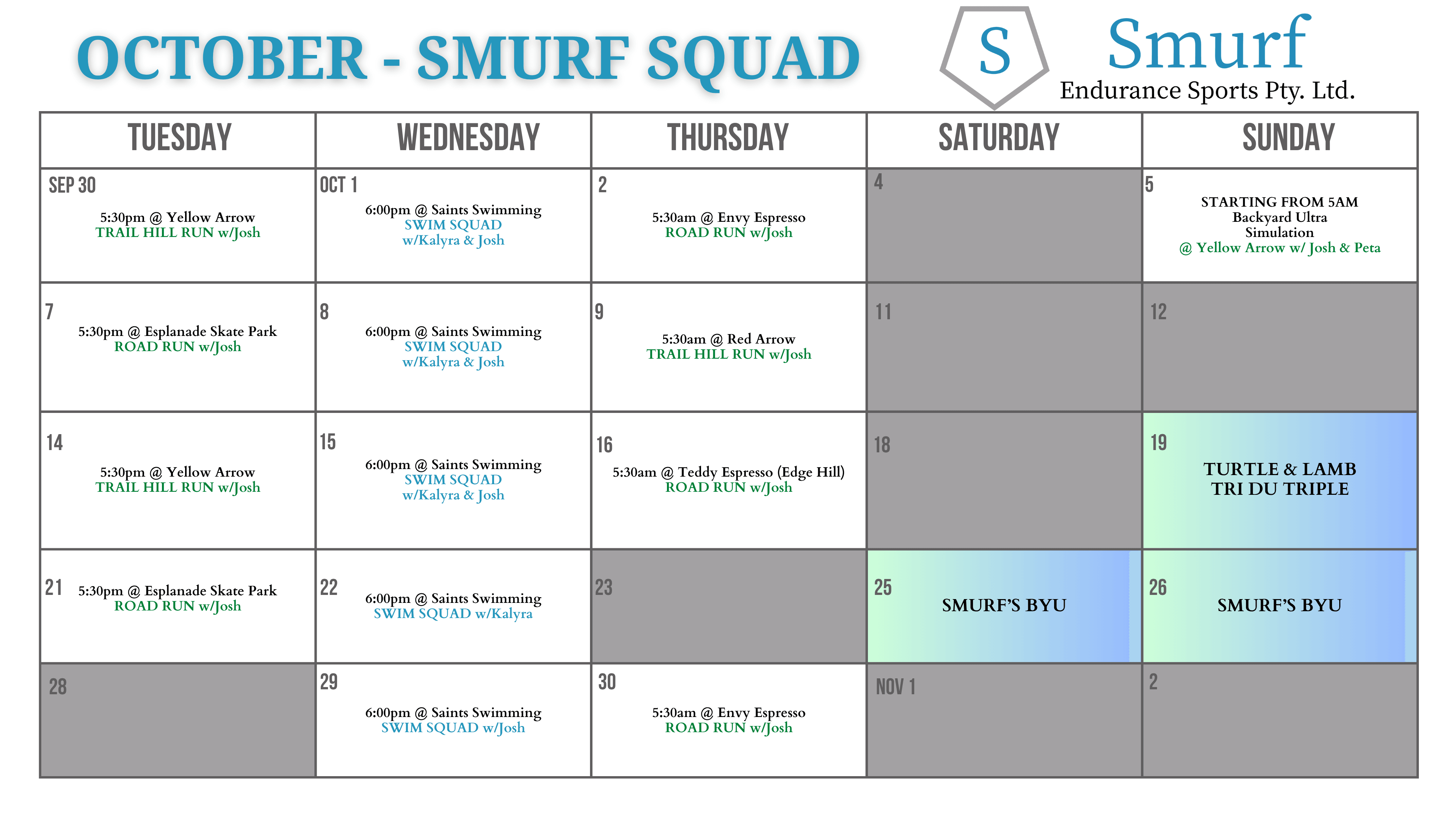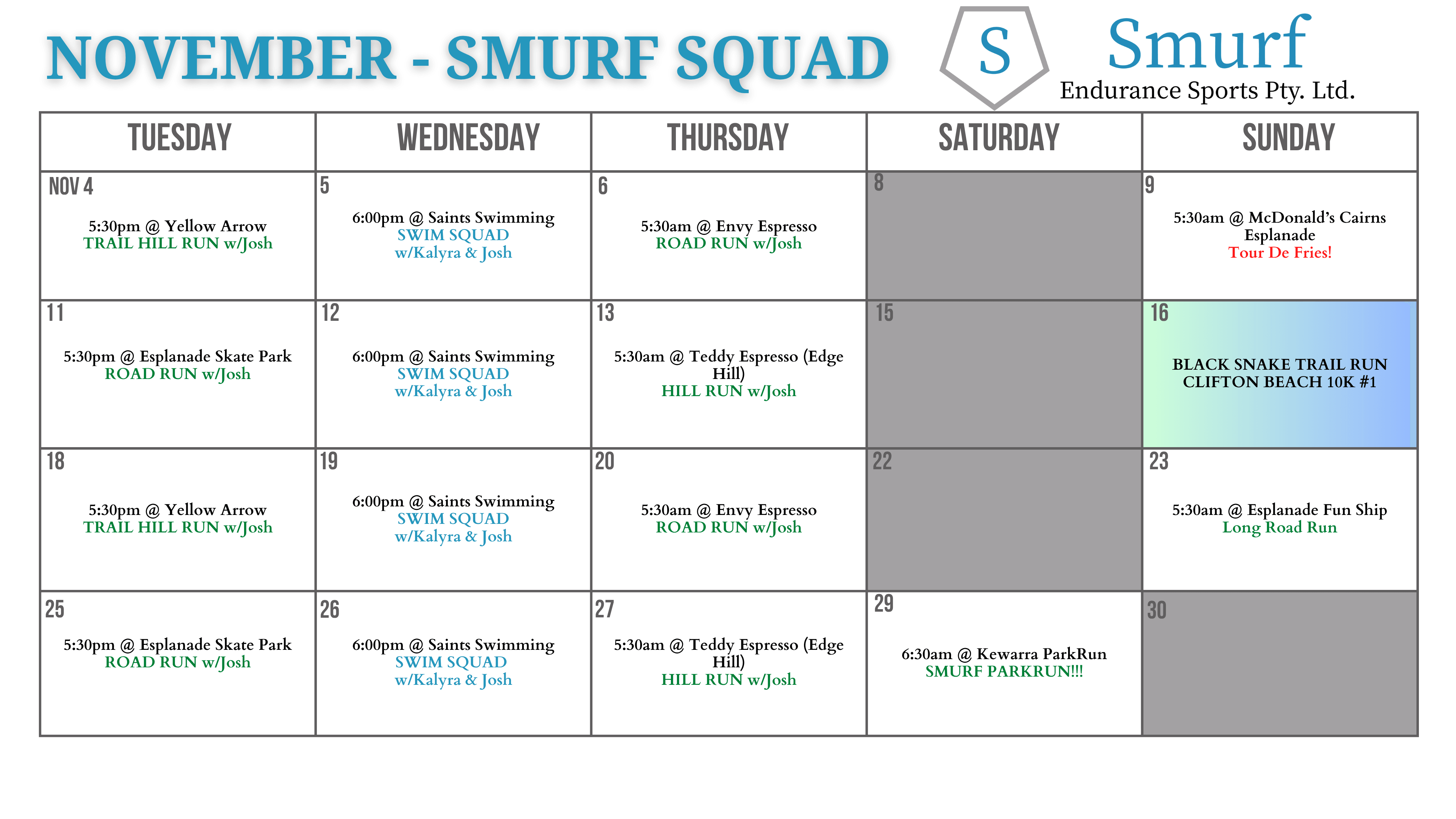 Where: Various locations (Barlow Park, Cairns Esplanade, Yellow/Red Arrows, St. Augustines College etc.) - follow our Facebook and Instagram pages for this month's squad sessions - latest calendar available below - book your sessions NOW